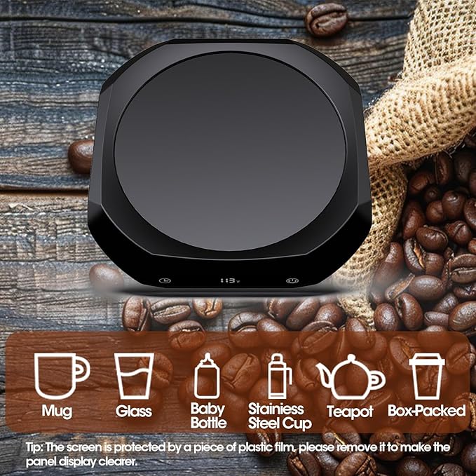 • Coffee Mug Warmer 3 Temperature Settings: 113℉, 131℉, 167℉. Touch display, one touch to set the temperature & timer off.This coffee warmer for desk can be used to heat most beverages, coffee, water, beverages, tea, milk, cocoa, etc